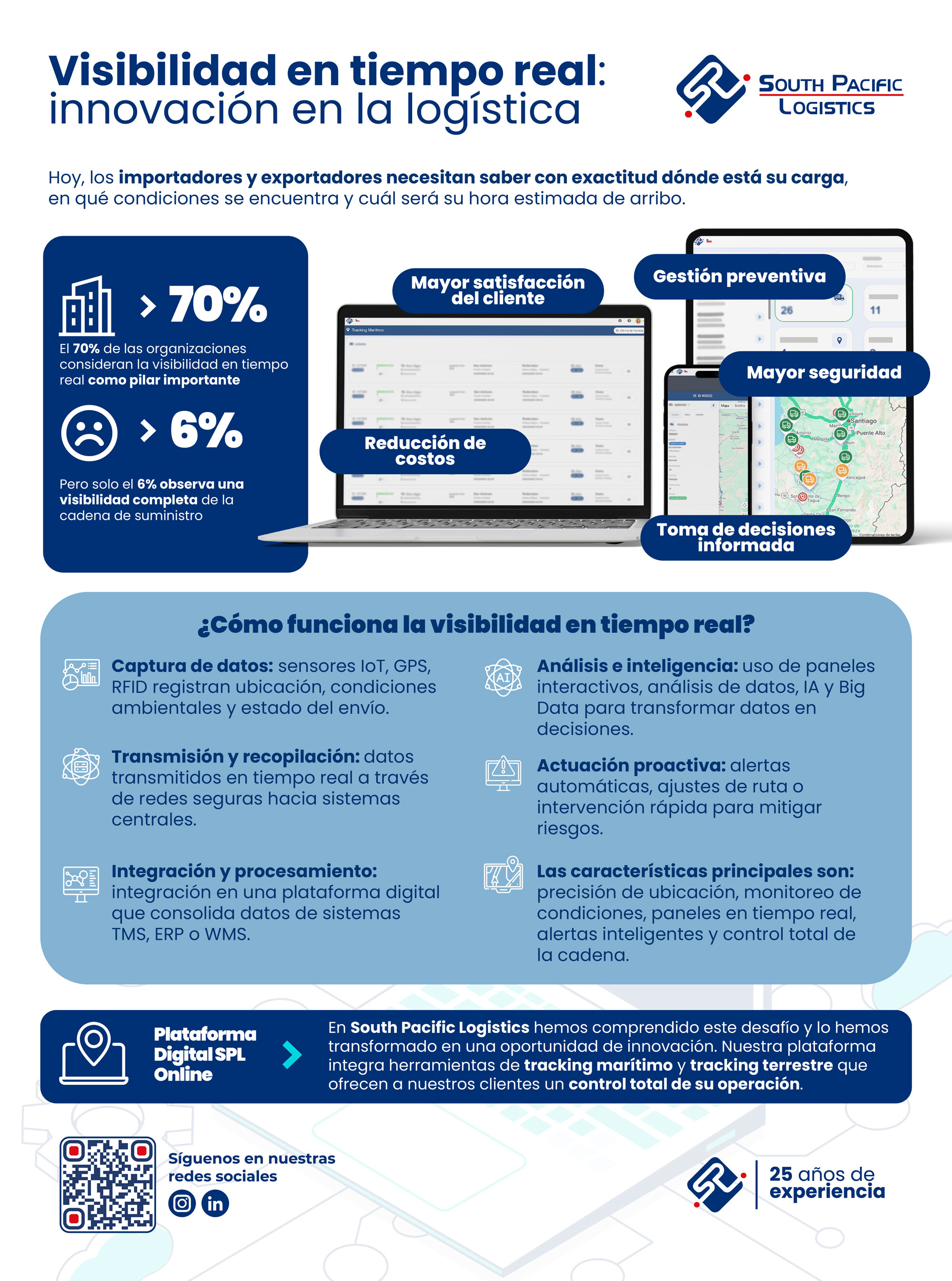 En South Pacific Logistics hemos comprendido este desafío y lo hemos transformado en una oportunidad de innovación. Nuestra plataforma digital SPL Online integra herramientas de tracking marítimo y tracking terrestre que ofrecen a nuestros clientes un control total de su operación. Gracias a dashboards personalizables, alertas automáticas y análisis de datos avanzados, nuestros clientes pueden tomar decisiones rápidas, garantizar la seguridad de su carga y optimizar el uso de sus recursos. La visibilidad en tiempo real que ofrecemos es, en definitiva, una ventaja competitiva que conecta el presente con el futuro de la logística internacional.