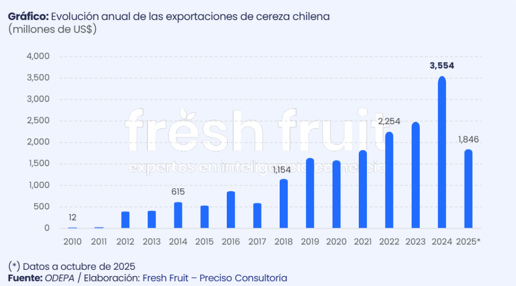 Hace diez años, las exportaciones chilenas de cereza eran un negocio pequeño y todavía en expansión. Hoy, entre enero y octubre del 2025, ya se han consolidado como uno de los pilares del sector frutícola. En este periodo, Chile exportó 463,565 toneladas por US$ 1,846 millones, cifras que contrastan con los envíos de hace una década, cuando apenas alcanzaban las 4.5 toneladas por US$ 12.2 millones. El crecimiento ha sido continuo, impulsado por la rápida expansión de área, la tecnificación del cultivo para obtener calibres más grandes y firmes, y la consolidación de un mercado que recompensa la fruta premium: China.