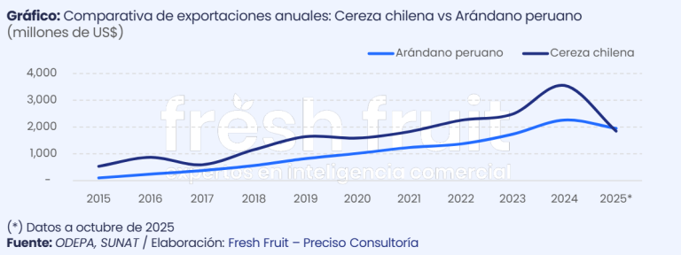 Estas diferencias explican por qué el Perú pudo escalar el arándano con rapidez, incluso superando la barrera de los US$ 1,000 millones en el 2020, pese a producirlo en zonas cálidas y cercanas al nivel del mar. En cambio, en Chile la cereza alcanzó ese mismo hito en el 2018, pero apoyándose en un clima templado-frío imposible de replicar en la costa peruana. Ambos cultivos comparten una velocidad de crecimiento extraordinaria los dos pasaron de exportar entre US$ 10 y 20 millones a superar los US$ 1,000 millones en aproximadamente ocho años, pero lo hicieron desde realidades climáticas completamente distintas. La cereza chilena prosperó gracias a un invierno frío y estaciones marcadas; el arándano peruano, en cambio, se desarrolló en un clima cálido y sin estaciones, gracias a su enorme capacidad de adaptación y al uso de variedades modernas.